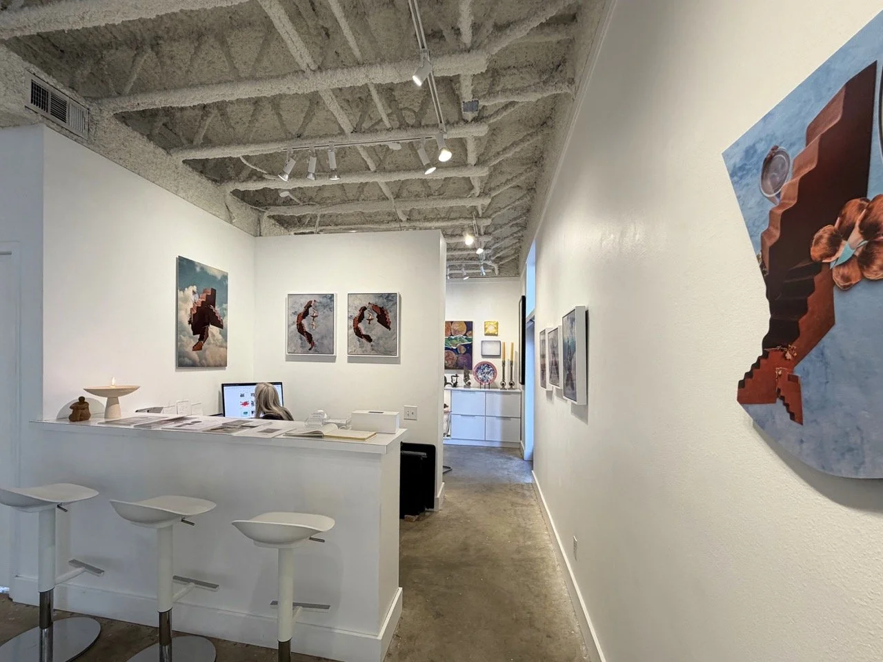 This is Mohsenin’s third solo show presented at HVFA. Her HVFA debut, Resurface, was highly acclaimed and celebrated in a documentary that aired around the world. She says that she created this body of work “during the time when I had limited space both mentally and physically to be creative,” and that the floating backgrounds “evoke the bliss and purity of childhood, where dreams are reality and evil is a far distant.” By laying the heavier forms against the lightness of the blue backdrop, Mohsenin reminds us to take the Weight Off the present moment by looking at it from a ten-thousands-feet-above that empowers one to push through before the Weight is back On again.